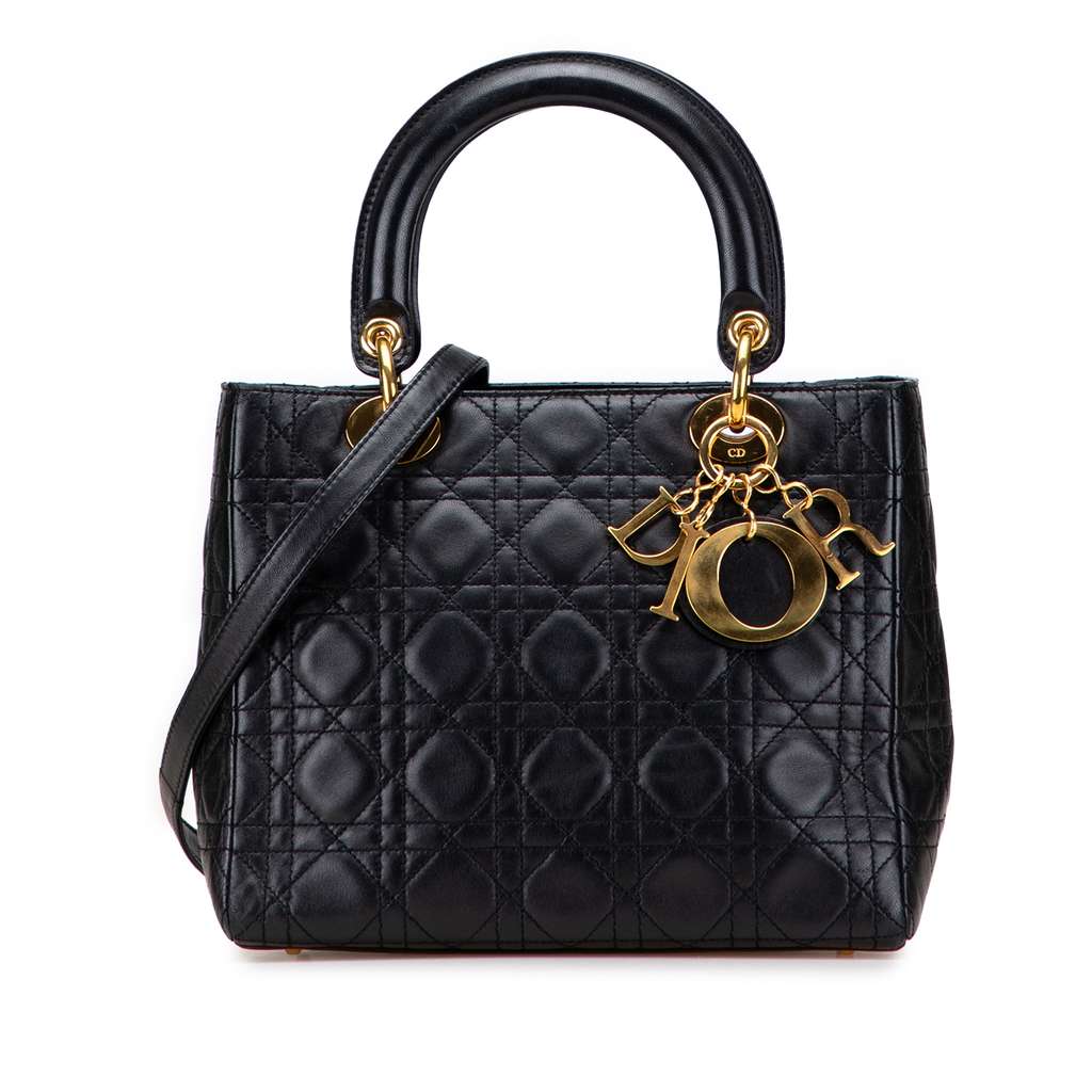 The Lady Dior features a quilted lambskin leather body, flat leather top handles, a detachable flat leather strap, a top zip closure, and an interior zip pocket.