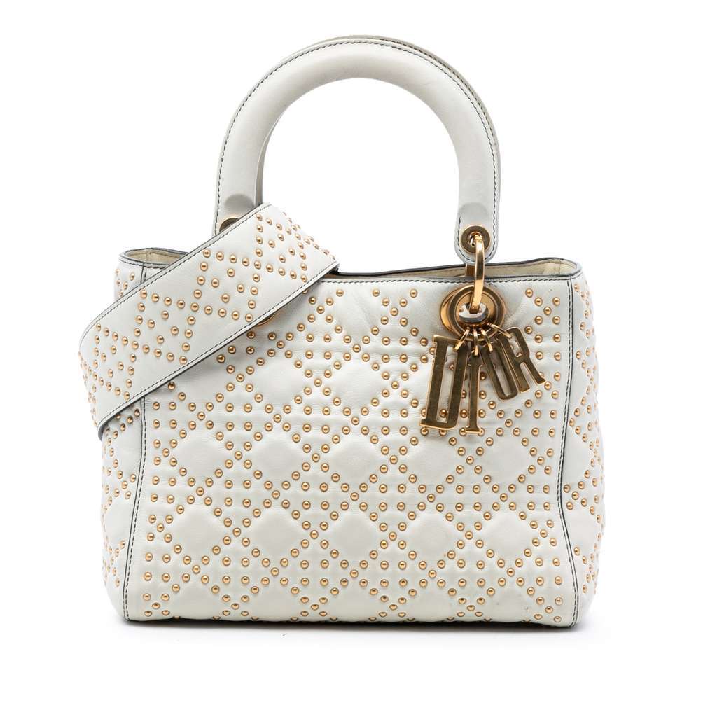 This satchel features a studded leather body, flat handles, a detachable flat strap, a fold-in flap closure, and an interior zip pocket.