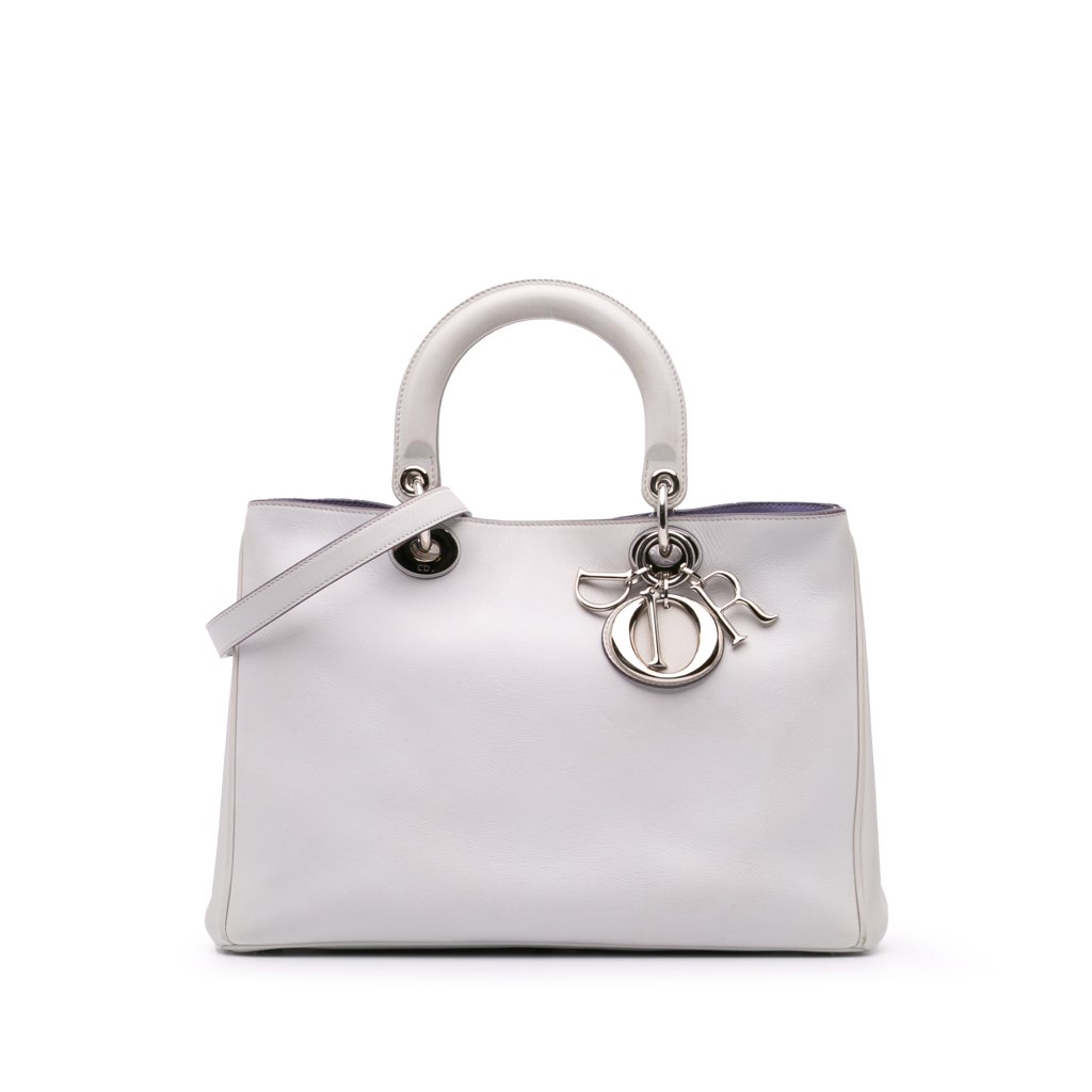 The Diorissimo features a leather body, flat leather top handles, a detachable and adjustable flat leather shoulder strap, an open top with magnetic snap closure, and interior slip pockets.