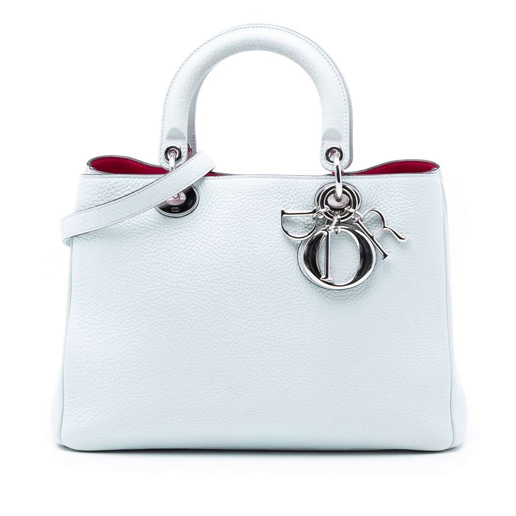 The Diorissimo features a leather body, a flat leather handles, a detachable flat leather strap, an open top with a magnetic snap closure, interior slip pockets, and an interior zip pouch.