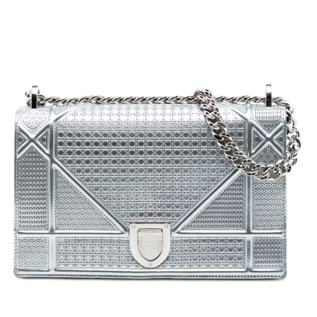 The Diorama features a patent leather body, a curb chain shoulder strap, a front flap with a push lock closure, and interior zip and slip pockets.