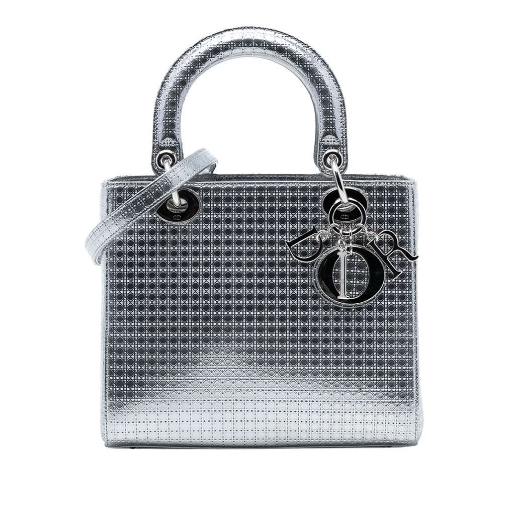 The Medium Microcannage Lady Dior features a quilted leather body, flat leather handles, a detachable strap, a top zip closure, and an interior zip pocket.