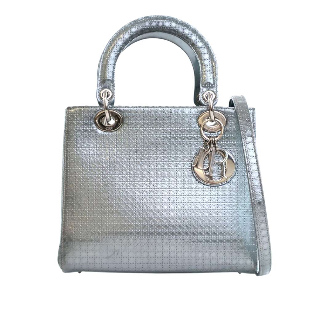 The Medium Microcannage Lady Dior features a quilted leather body, flat leather handles, a detachable strap, a top zip closure, and an interior zip pocket.