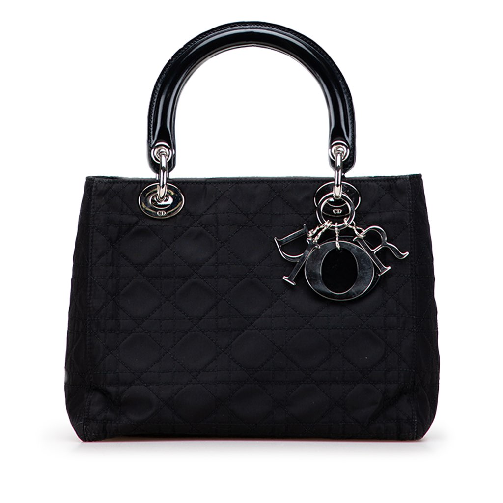 The Lady Dior features a quilted nylon body, flat leather top handles, a top zip closure, and an interior zip pocket.