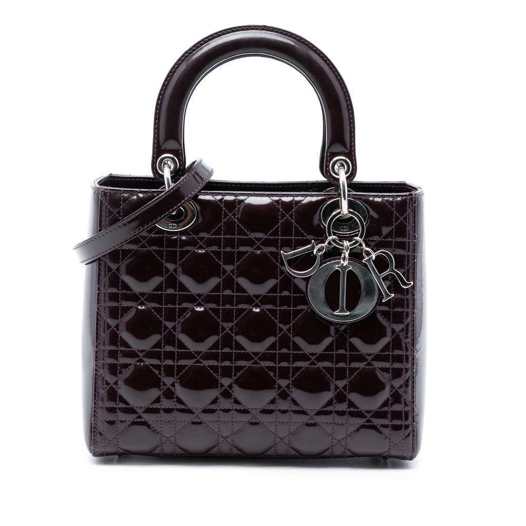 The Lady Dior features a quilted patent leather body, flat leather top handles, a detachable flat leather strap, a top zip closure, and an interior zip pocket.