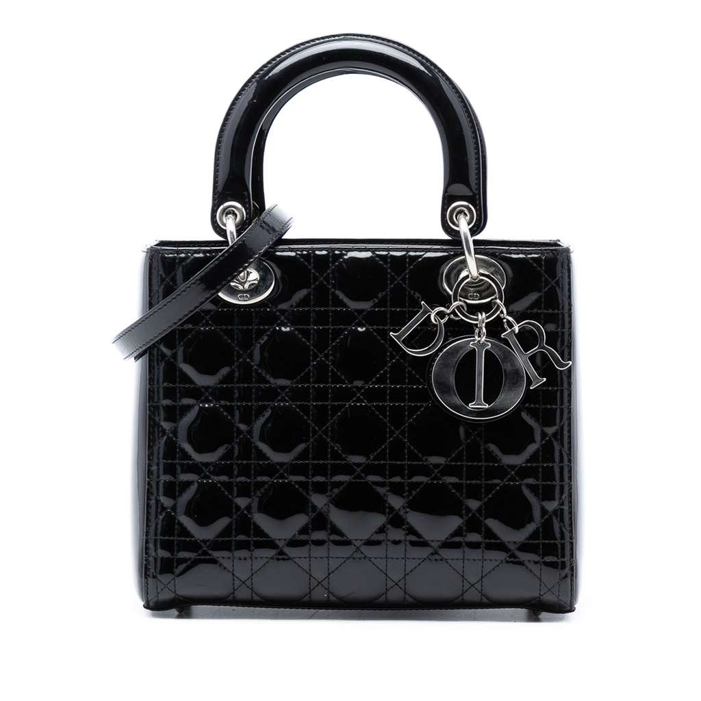 The Lady Dior features a quilted patent leather body, flat leather top handles, a detachable flat leather strap, a top zip closure, and an interior zip pocket.