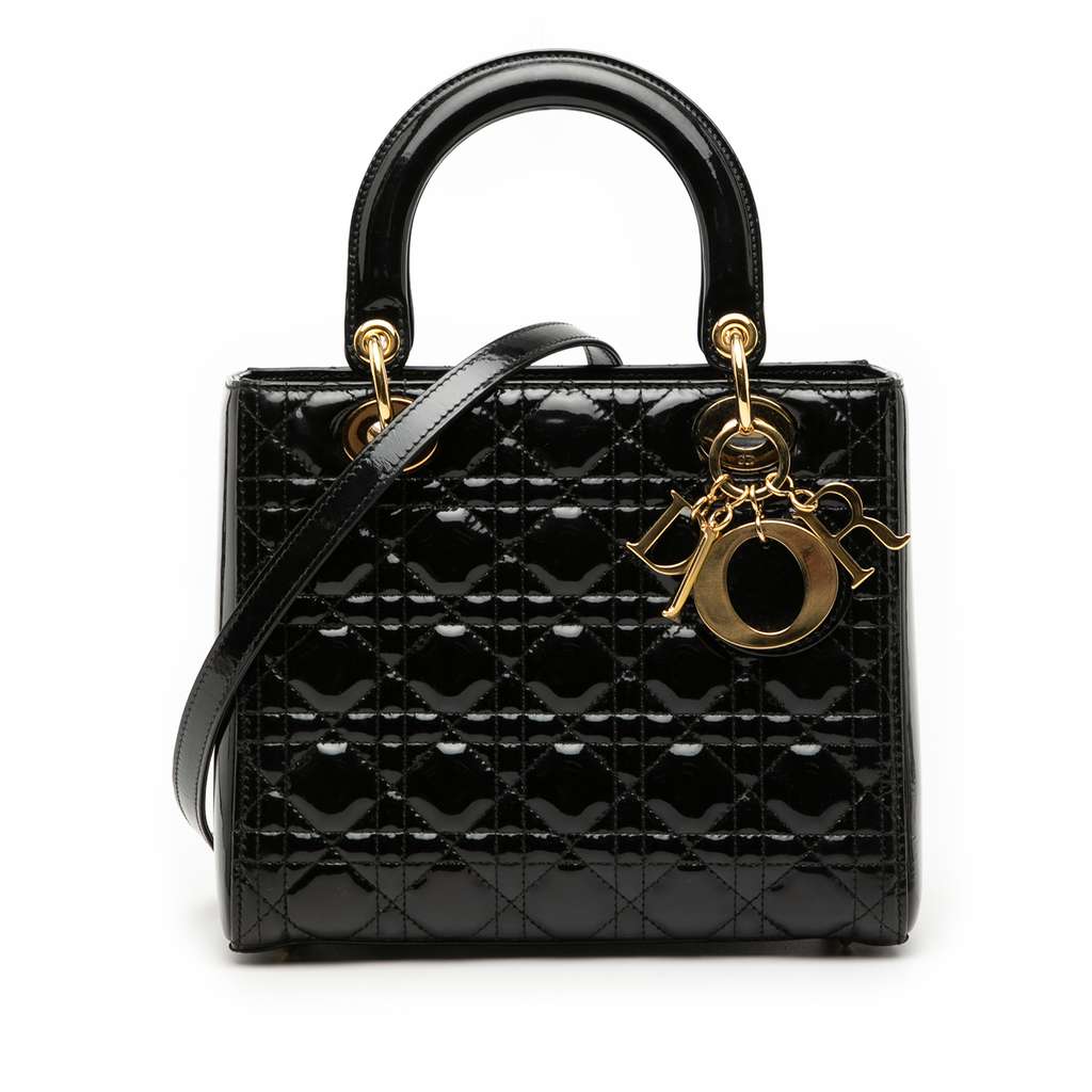 The Lady Dior features a quilted patent leather body, flat leather top handles, a detachable flat leather strap, a top zip closure, and an interior zip pocket.