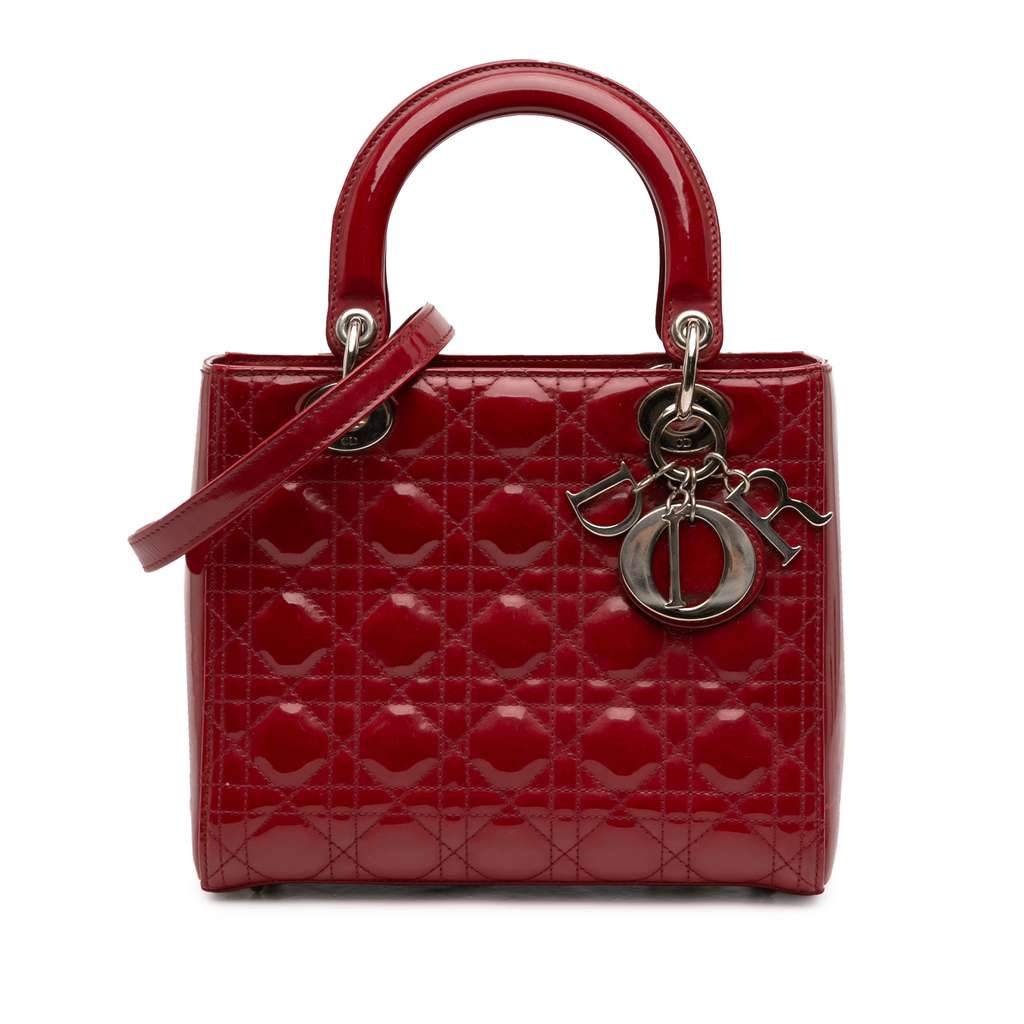 The Lady Dior features a quilted patent leather body, flat leather top handles, a detachable flat leather strap, a top zip closure, and an interior zip pocket.