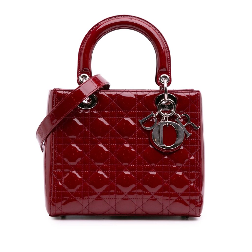 The Lady Dior features a quilted patent leather body, flat leather top handles, a detachable flat leather strap, a top zip closure, and an interior zip pocket.