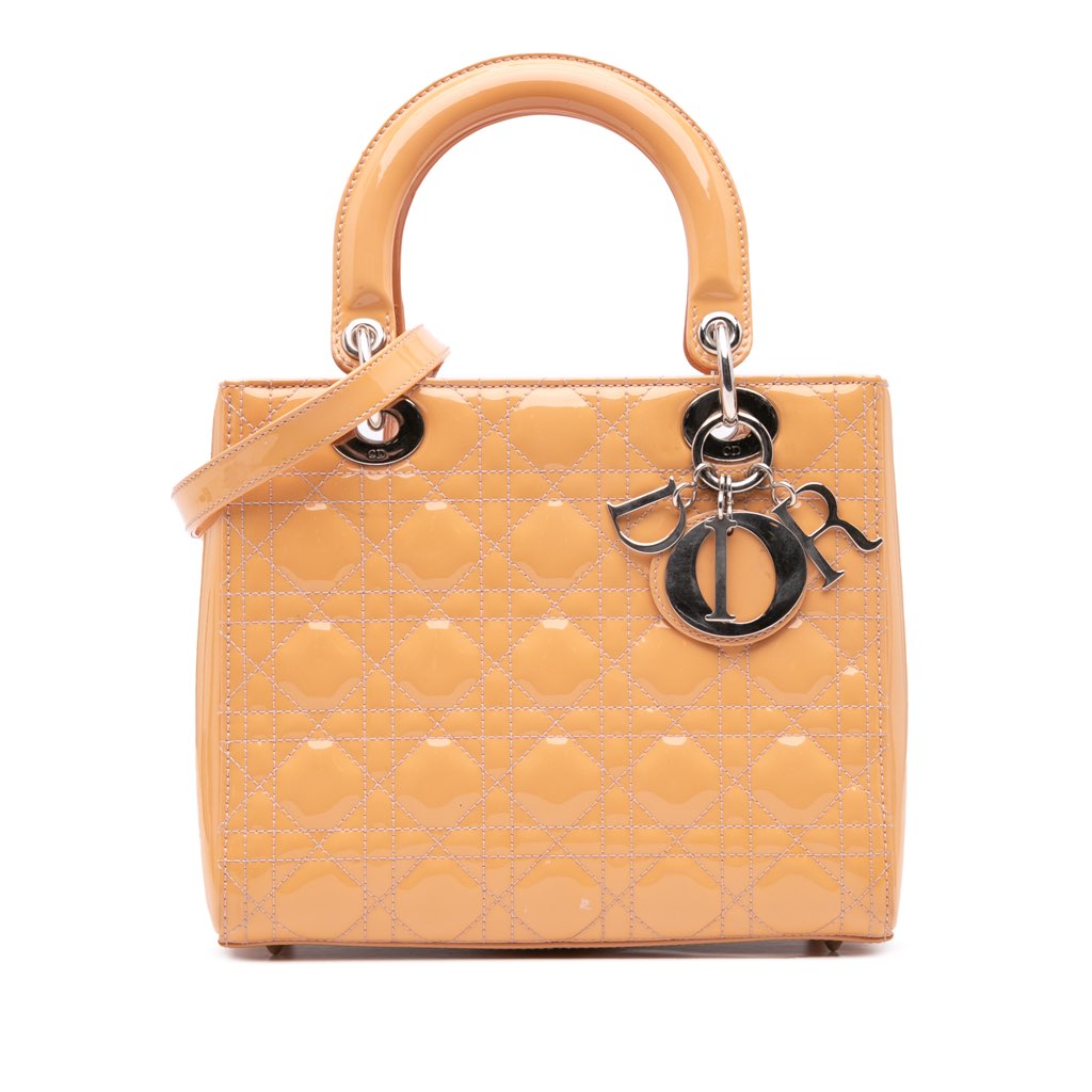 The Lady Dior features a quilted patent leather body, flat leather top handles, a detachable flat leather shoulder strap, a top zip closure, and an interior zip pocket.