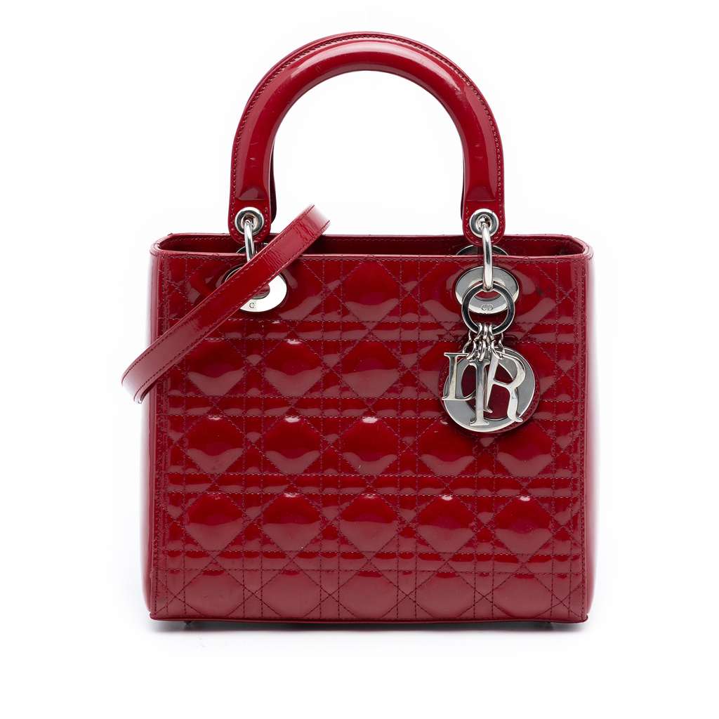 The Lady Dior features a quilted patent leather body, flat leather top handles, a detachable flat leather strap, a top zip closure, and an interior zip pocket.