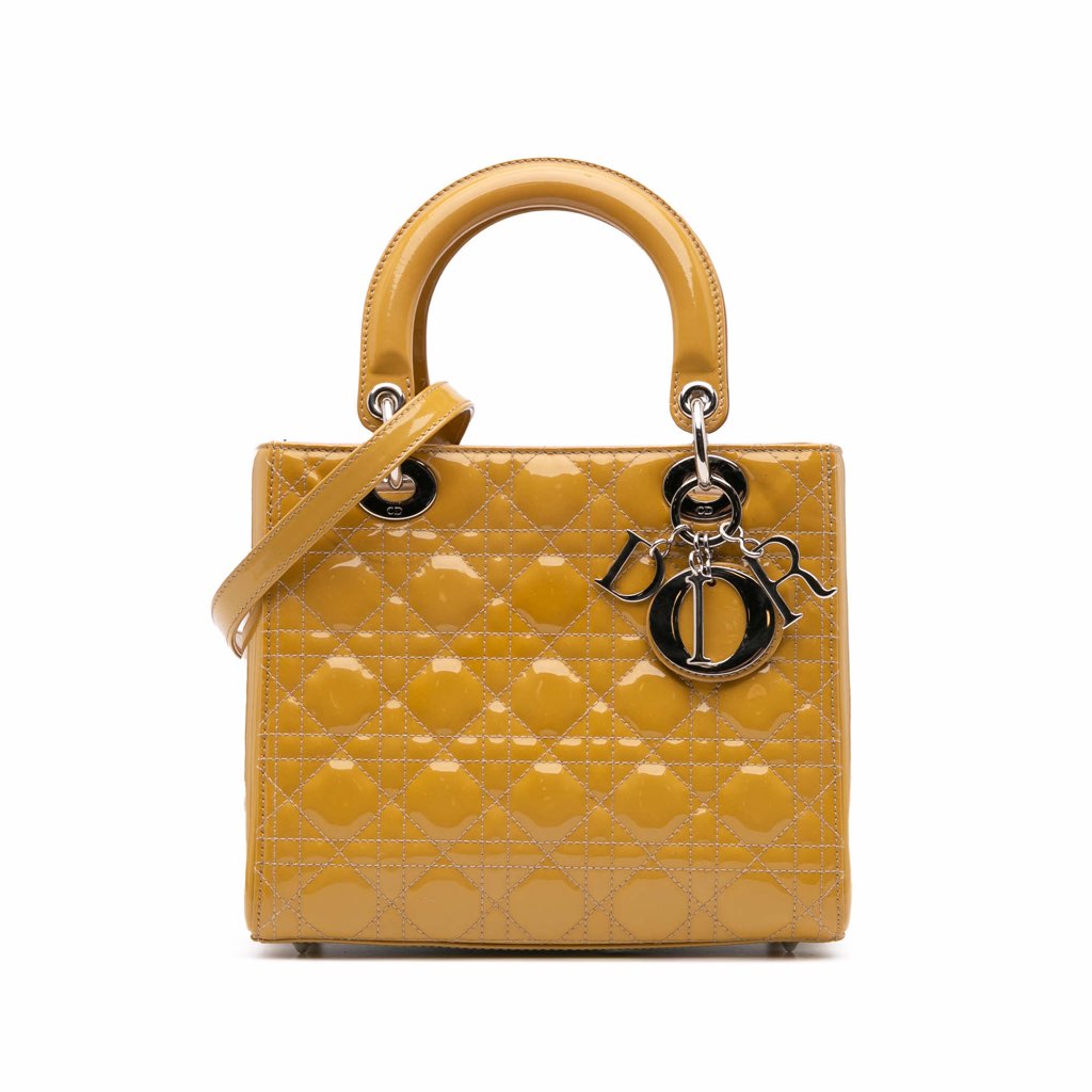 The Lady Dior features a quilted patent leather body, flat leather top handles, a detachable flat leather shoulder strap, a top zip closure, and an interior zip pocket.