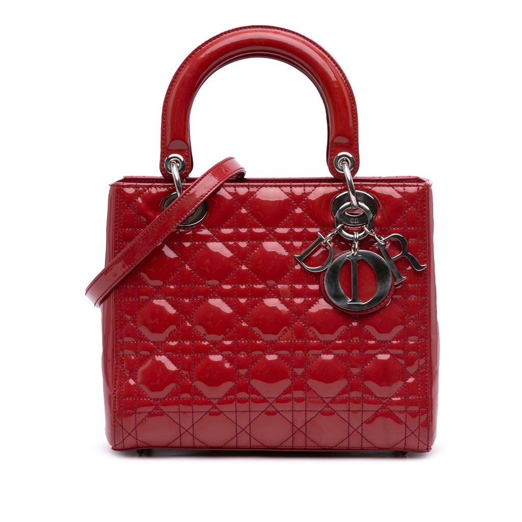 The Lady Dior features a patent leather body, flat leather top handles, a detachable flat leather strap, a top zip closure, and an interior zip pocket.