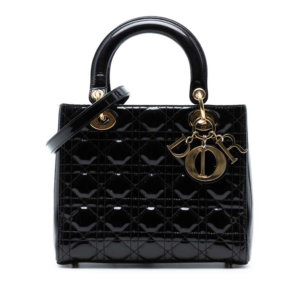 The Lady Dior features a quilted patent leather body, flat leather top handles, a detachable flat leather strap, a top zip closure, and an interior zip pocket.