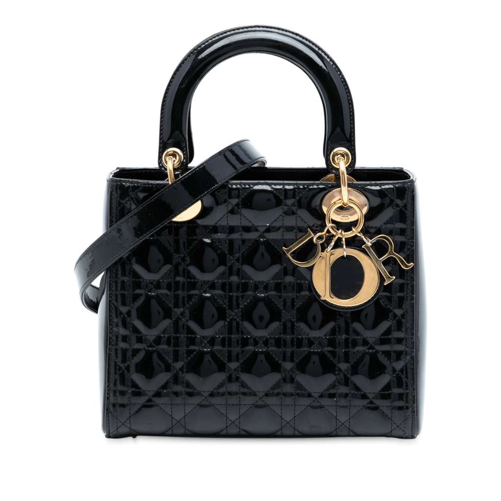 The Lady Dior features a quilted patent leather body, flat leather top handles, a detachable flat leather strap, a top zip closure, and an interior zip pocket.