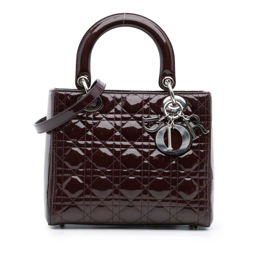 The Lady Dior features a quilted patent leather body, silver hardware, flat leather top handles, a detachable flat leather shoulder strap, a top zip closure, and an interior zip pocket.