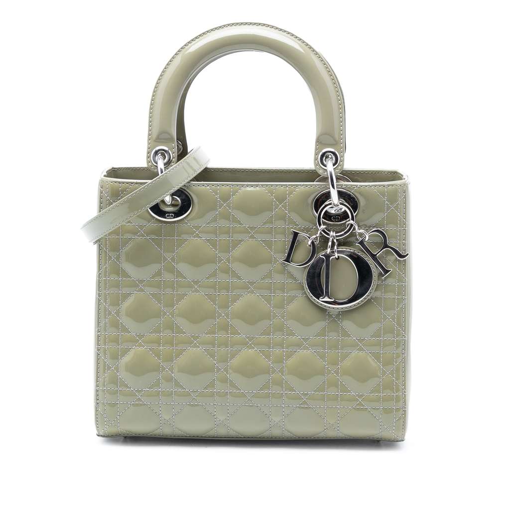 The Lady Dior features a quilted patent leather body, flat leather top handles, a detachable flat leather shoulder strap, a top zip closure, and an interior zip pocket.