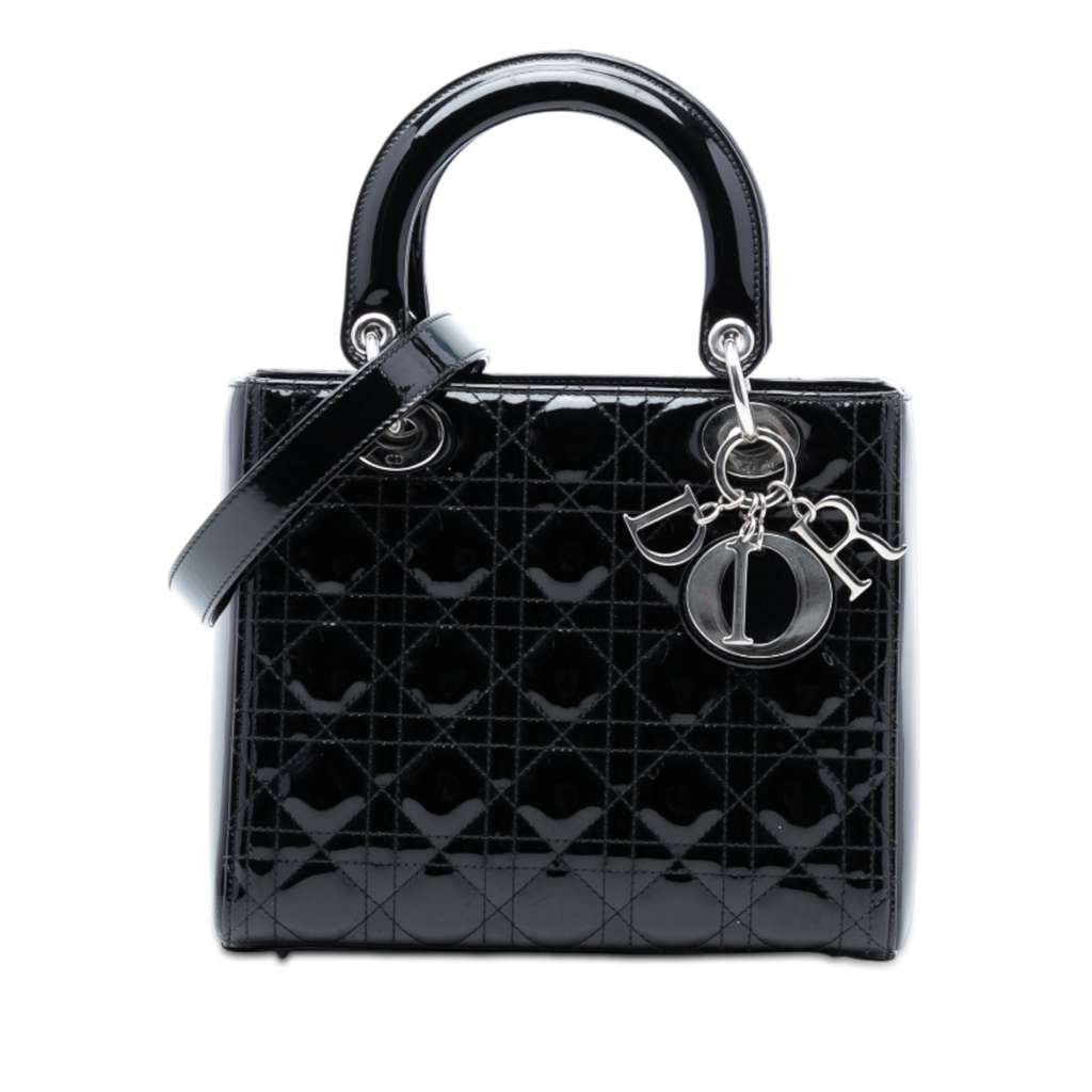 The Lady Dior features a quilted patent leather body, flat leather top handles, a detachable flat leather strap, a top zip closure, and an interior zip pocket.