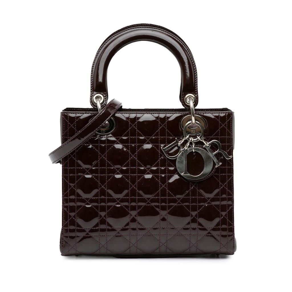 The Lady Dior features a quilted patent leather body, flat leather top handles, a detachable flat leather strap, a top zip closure, and an interior zip pocket.