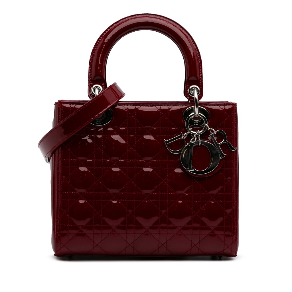 The Lady Dior features a quilted patent leather body, flat leather top handles, a detachable flat leather strap, a top zip closure, and an interior zip pocket.