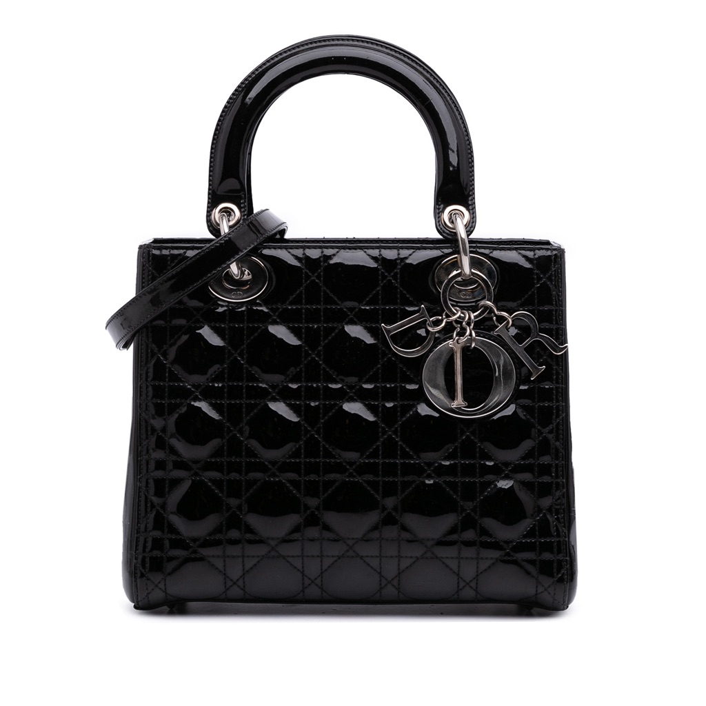 The Lady Dior features a quilted patent leather body, flat leather top handles, a detachable flat leather strap, a top zip closure, and an interior zip pocket.