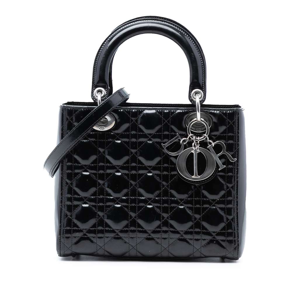 The Lady Dior features a quilted patent leather body, flat leather top handles, a detachable flat leather strap, a top zip closure, and an interior zip pocket.