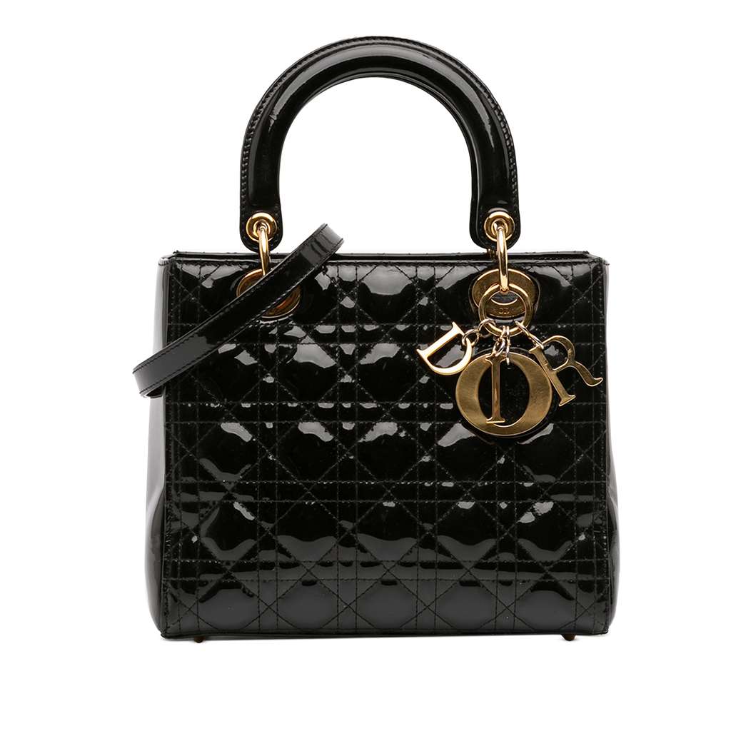 The Lady Dior features a quilted patent leather body, flat leather top handles, a detachable flat leather strap, a top zip closure, and an interior zip pocket.