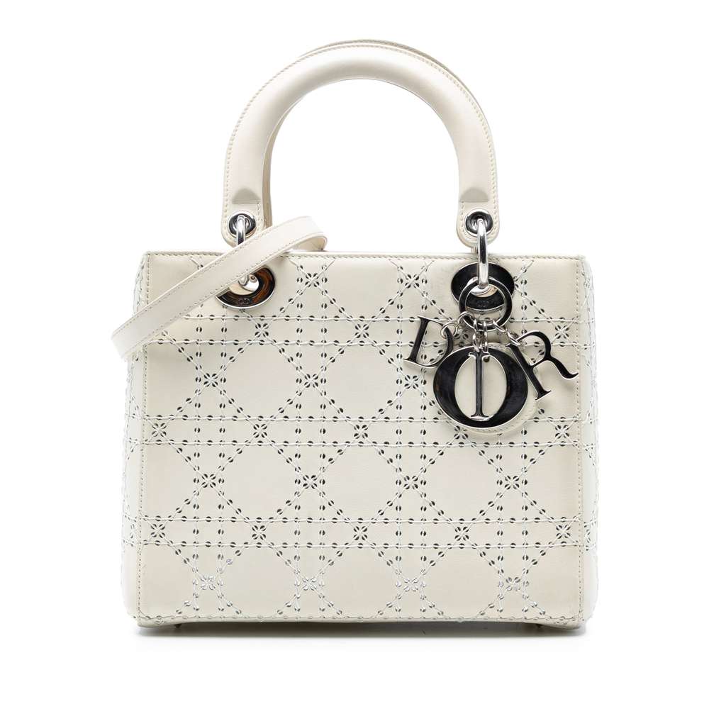 The Lady Dior features a perforated leather body, flat leather top handles, a detachable flat leather strap, a top zip closure, and an interior zip pocket.