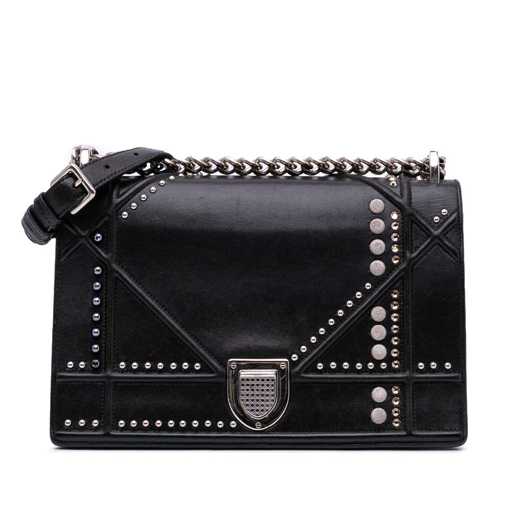 The Diorama Flap bag features a studded leather body, a chain and leather shoulder strap, a front flap with a push lock closure, and interior zip and slip pockets.