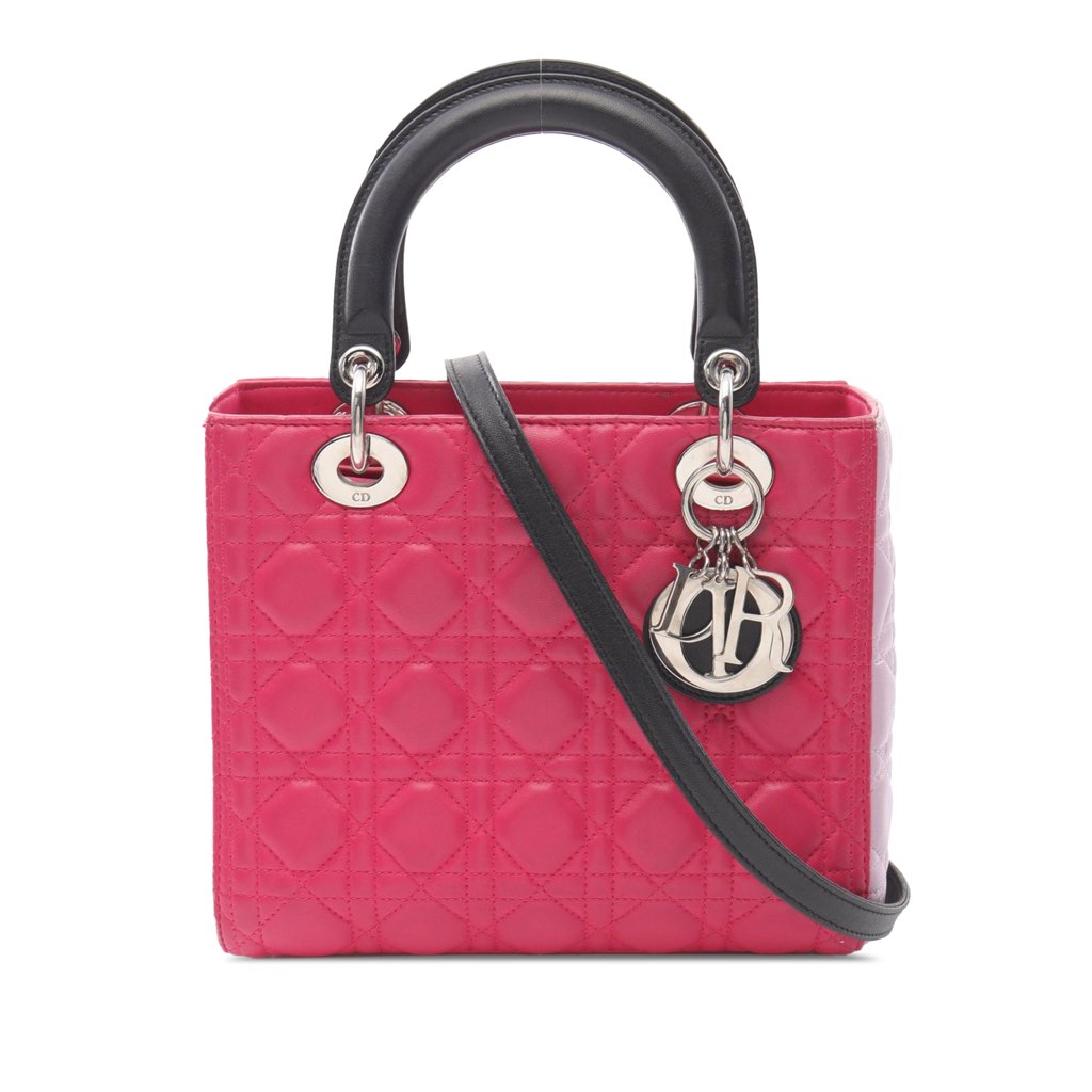 The Lady Dior features a quilted leather body, flat leather top handles, a detachable flat leather shoulder strap, a top zip closure, and an interior zip pocket.