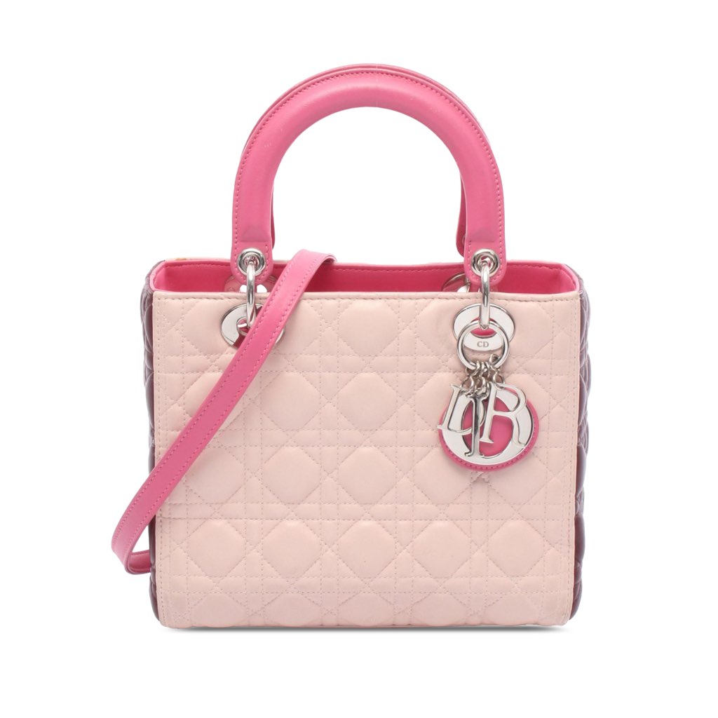 The Lady Dior features a quilted lambskin leather body, flat leather top handles, a detachable flat leather strap, a top zip closure, and an interior zip pocket.