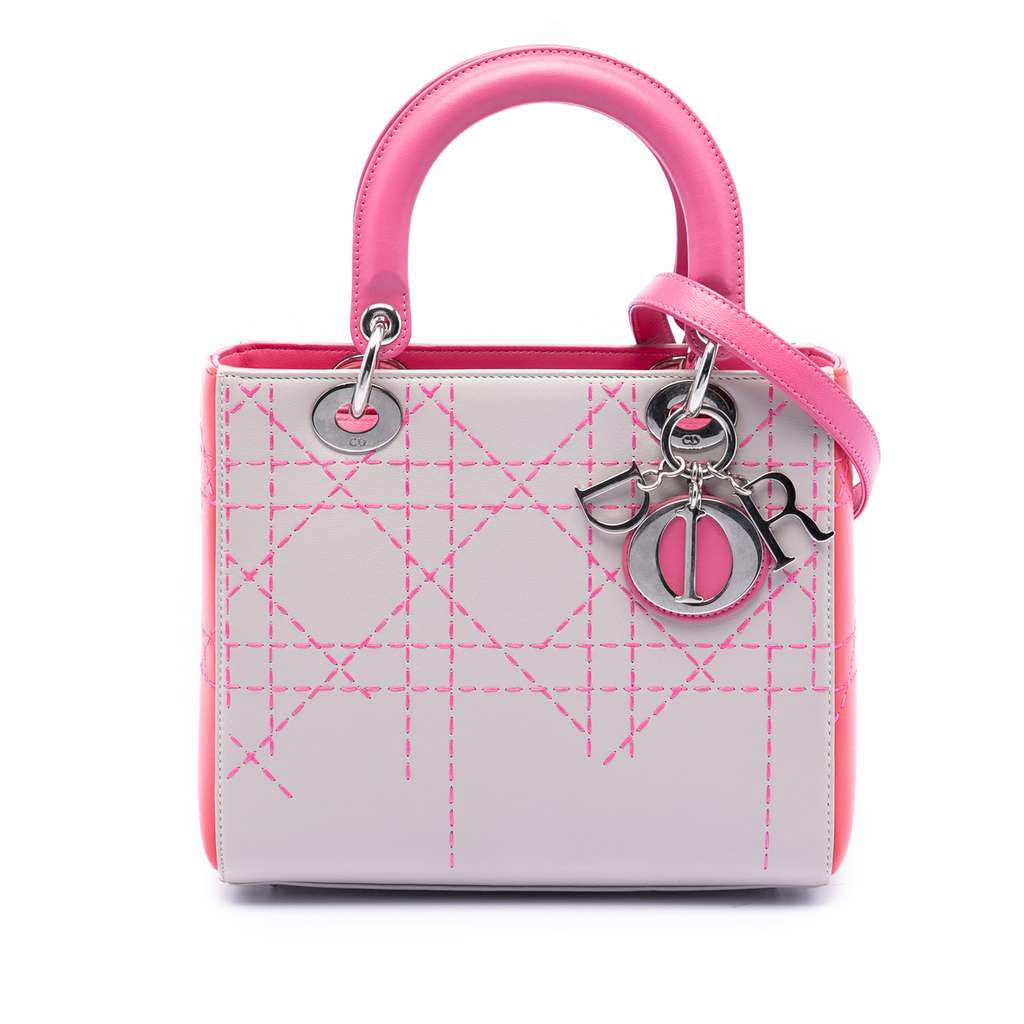 The Lady Dior features a lambskin leather body, flat leather top handles, a detachable flat leather shoulder strap, a top zip closure, and an interior zip pocket.