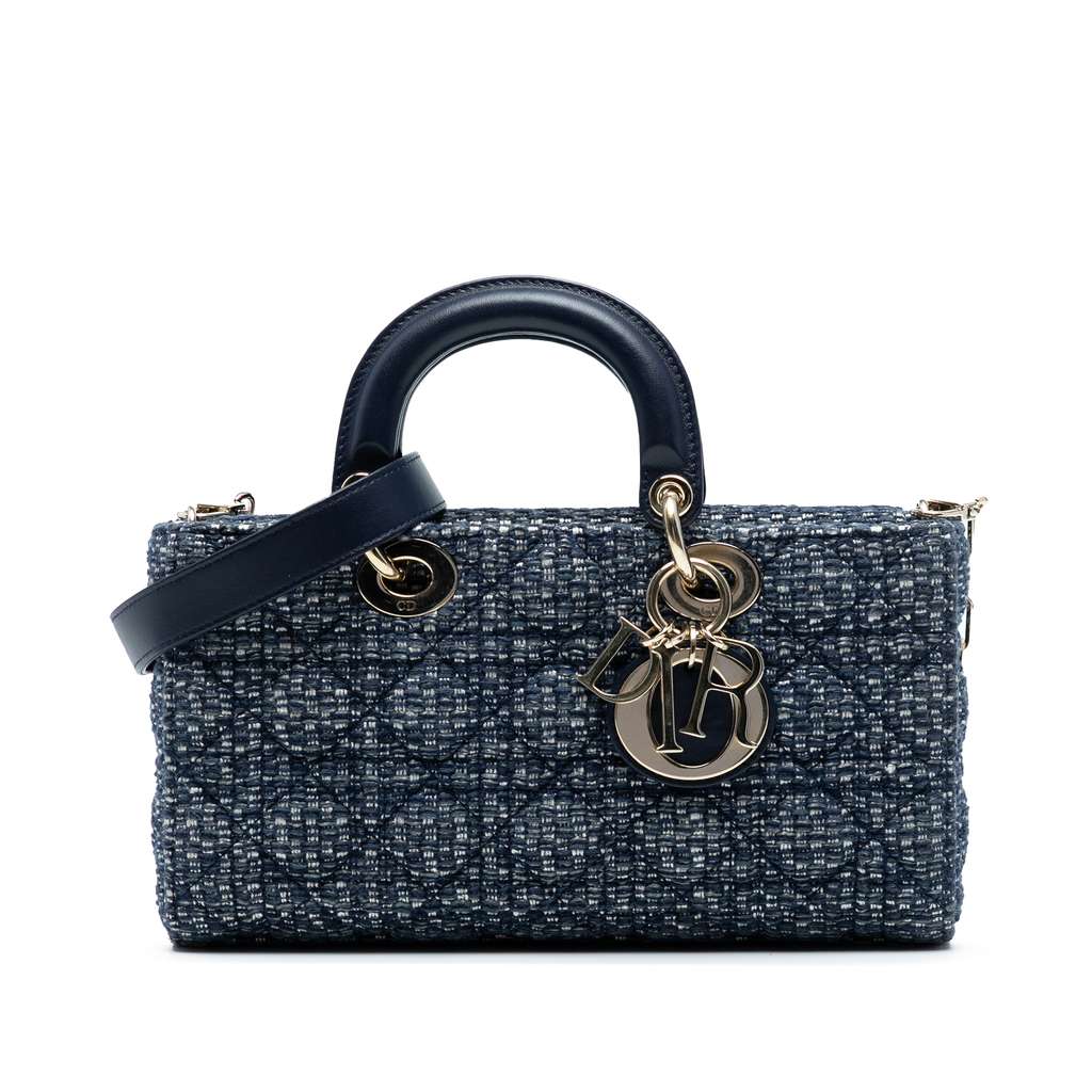 The Lady D Joy features a quilted tweed body, flat leather top handles, a detachable flat leather strap, a top flap closure, and an interior slip pocket.