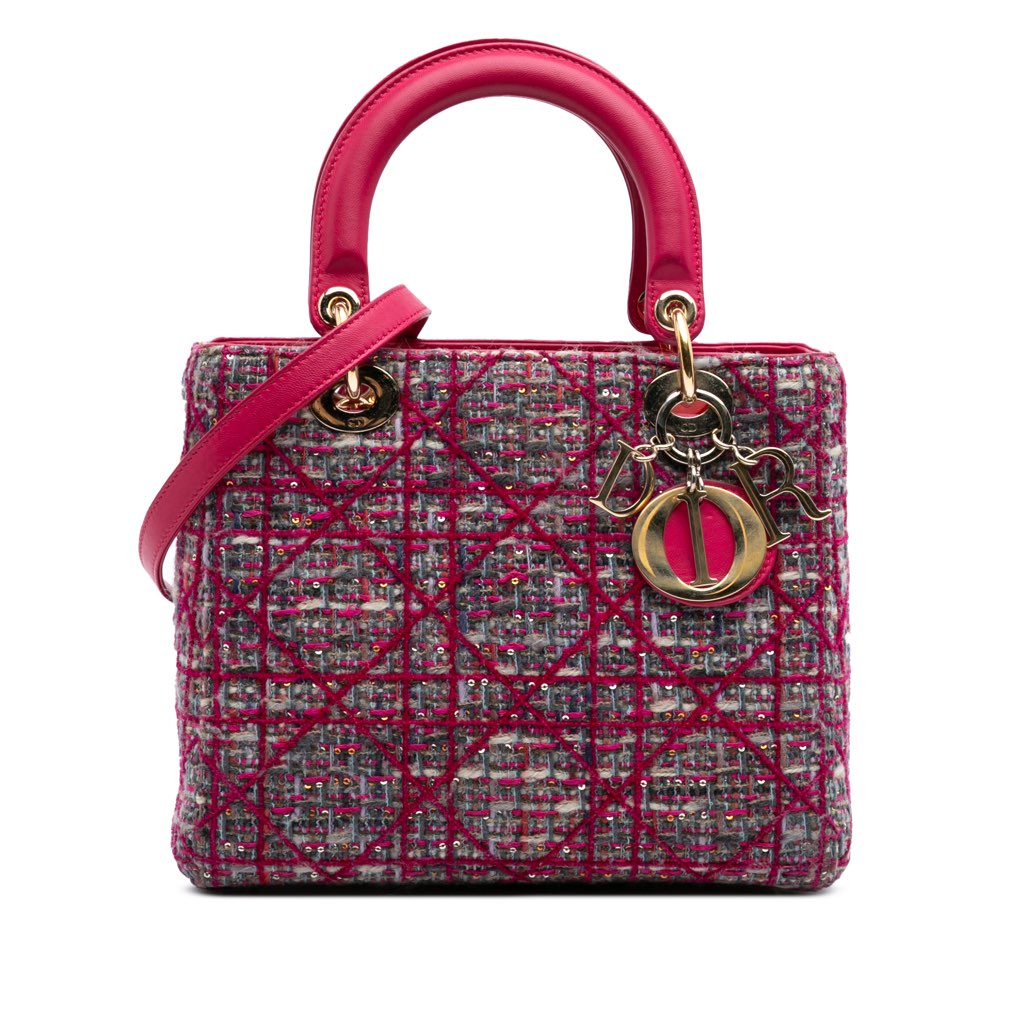 The Lady Dior features a tweed body, flat leather handles, a detachable flat strap, a top zip closure, and an interior zip pocket.