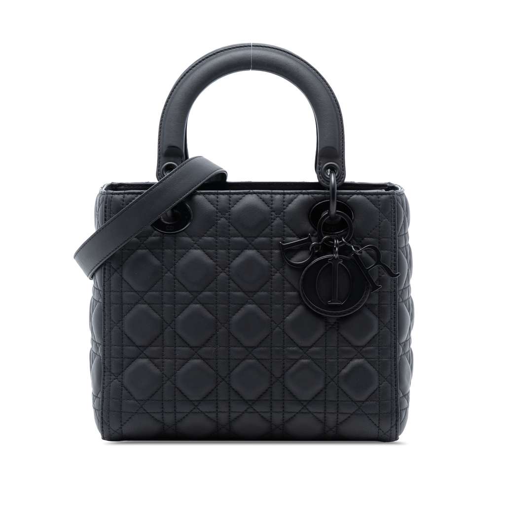 The Lady Dior features a quilted leather body, flat leather top handles, a detachable and adjustable flat leather shoulder strap, a fold-in flap closure, and interior zip and slip pockets.