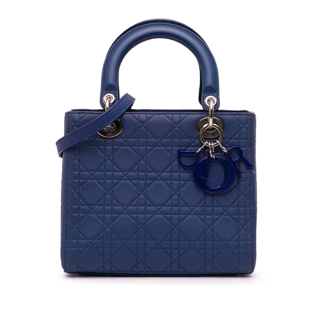 The Lady Dior features a cannage embossed leather body, flat leather top handles, a detachable flat leather strap, a top zip closure, and an interior zip pocket.
