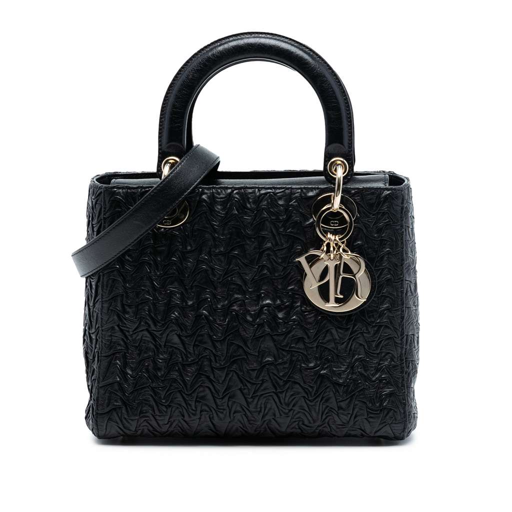 The Lady Dior features a pleated leather body, flat handles, a detachable chain strap, a top flap closure, and an interior zip pocket.