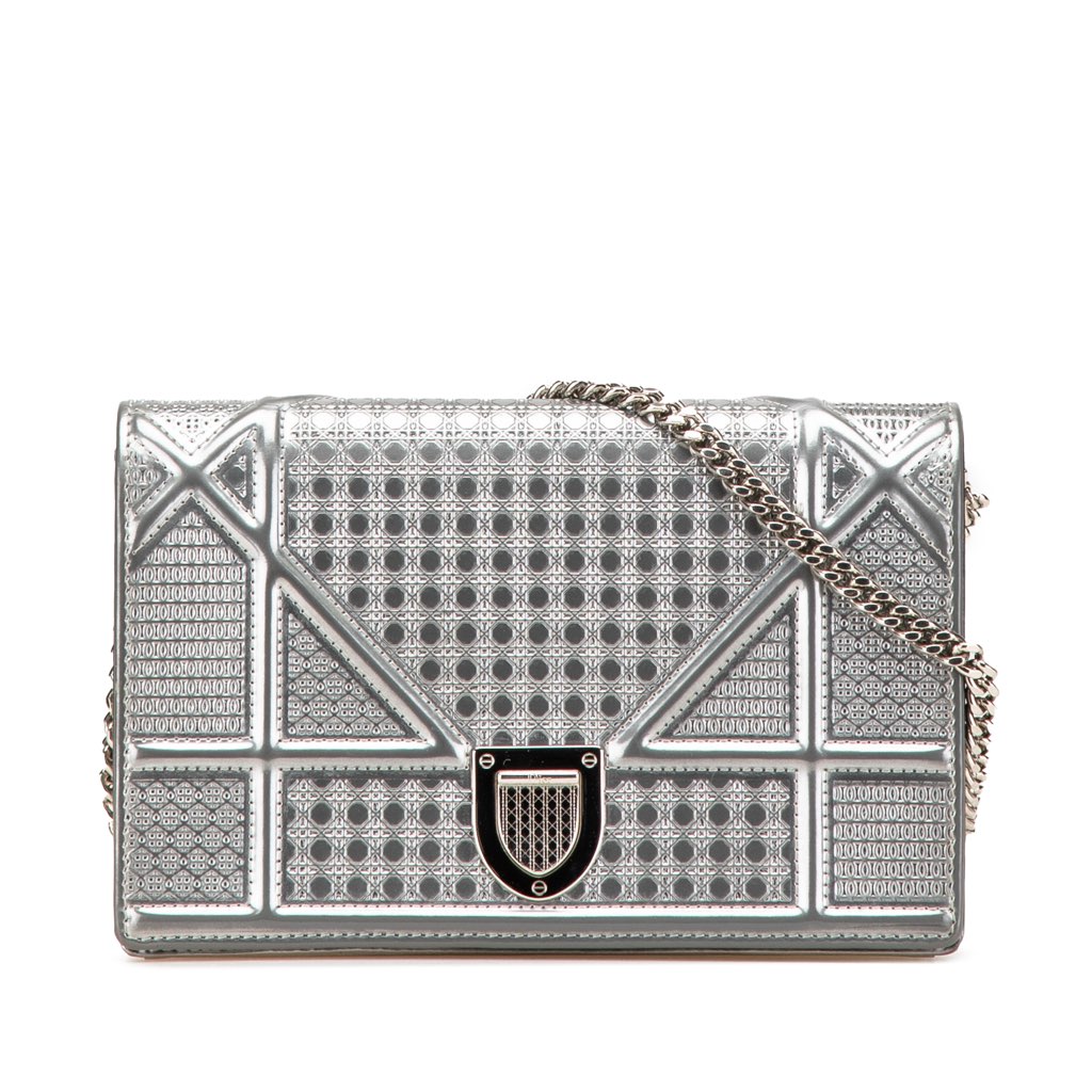 This wallet on chain features a patent leather body, a detachable silver-tone chain link shoulder strap, a front flap with a push lock closure, and interior zip and slip pockets.