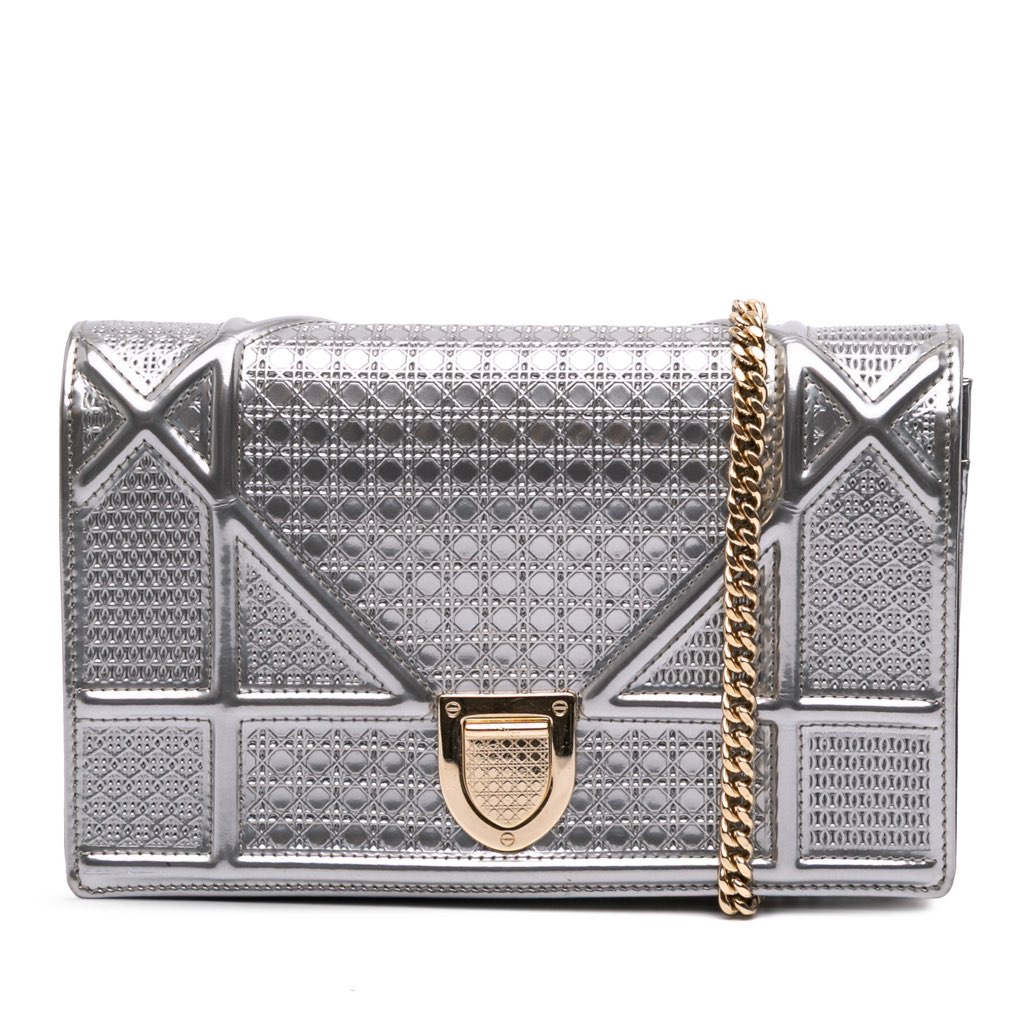 This wallet on chain features a patent leather body, a detachable silver-tone chain shoulder strap, a front flap with a push lock closure, and interior zip and slip pockets.