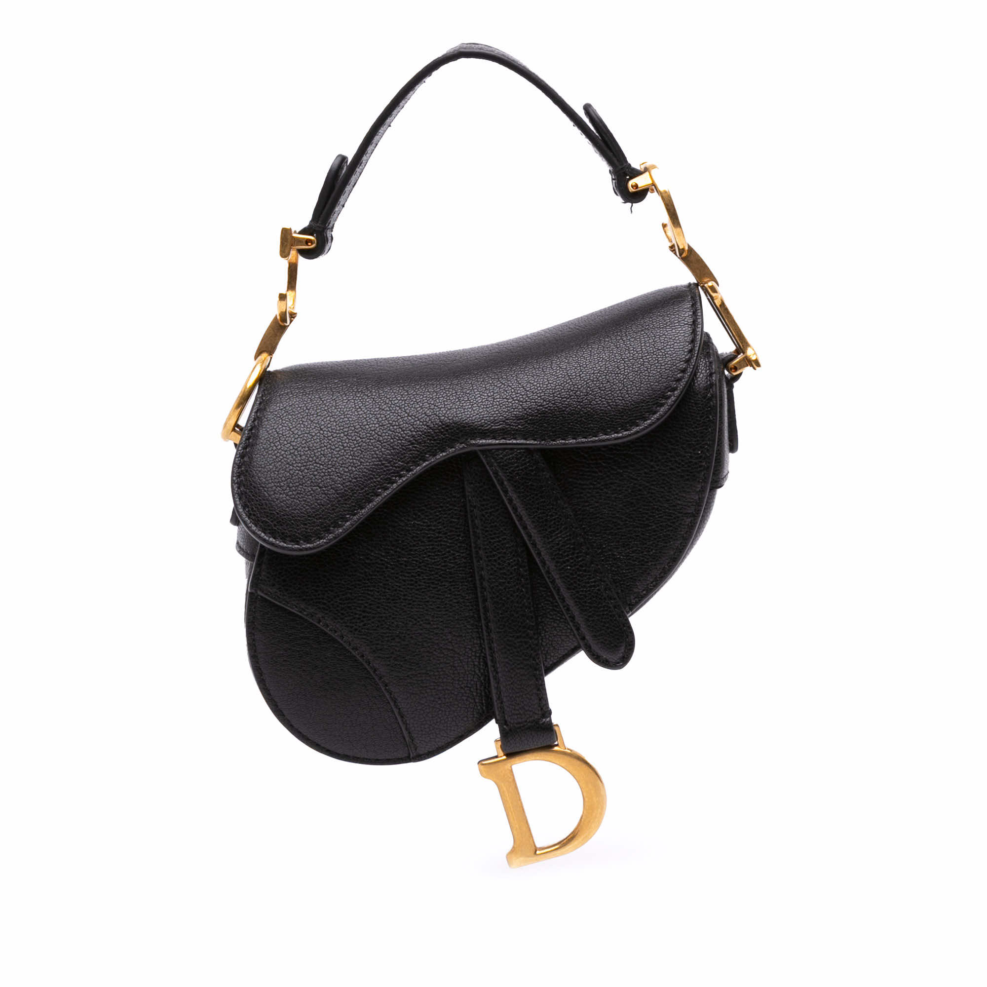 The Saddle features a goatskin leather body, a flat leather strap with CD hardware, a front flap with leather tabs and D charm, and an interior slip pocket.