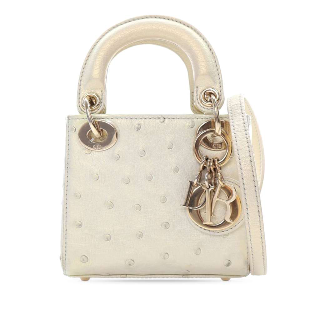 The Lady Dior features an iridescent ostrich leather body, flat leather top handles, a detachable flat leather shoulder strap, and a fold-in flap closure.