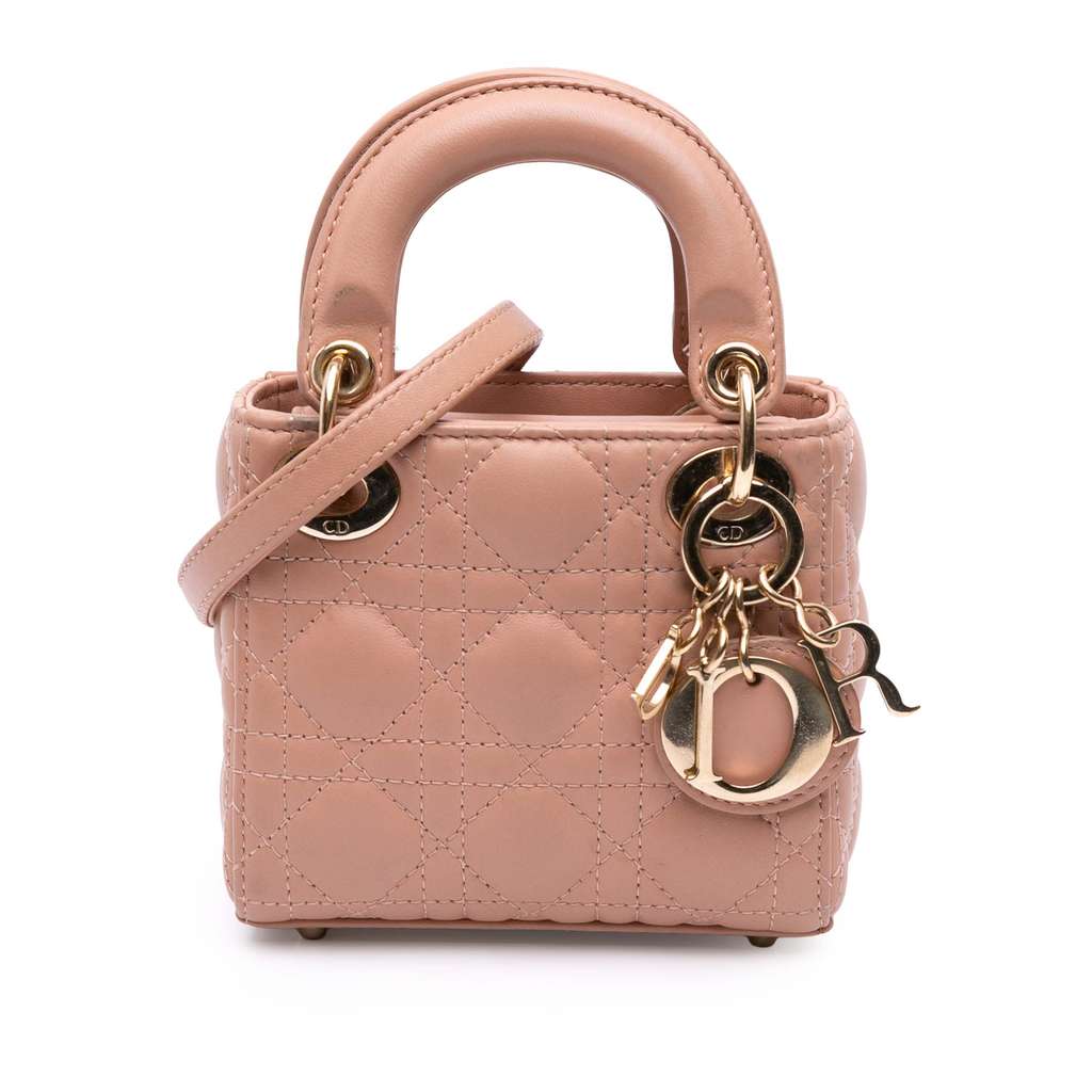 The Micro Lady Dior features a quilted lambskin leather body, flat leather top handles, a detachable flat leather shoulder strap, and a fold-in flap closure.