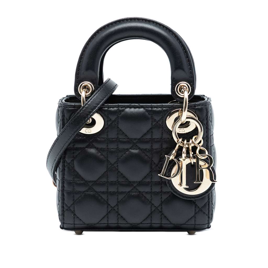 The Lady Dior features a quilted lambskin leather body, flat leather top handles, a detachable flat leather shoulder strap, and a fold-in flap closure.
