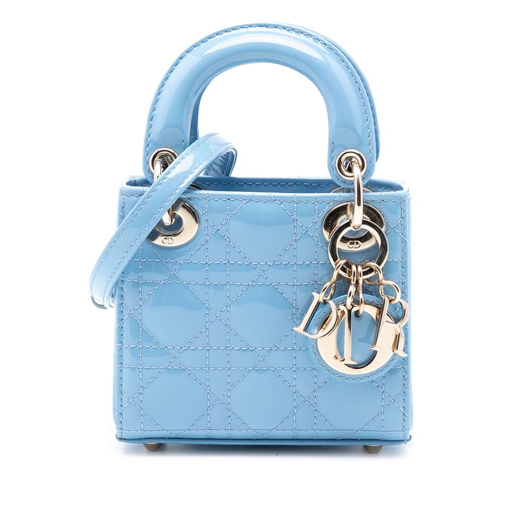 The Lady Dior features a quilted patent leather body, flat top handles, a detachable flat leather strap, a fold-in flap closure, and an interior slip pocket.