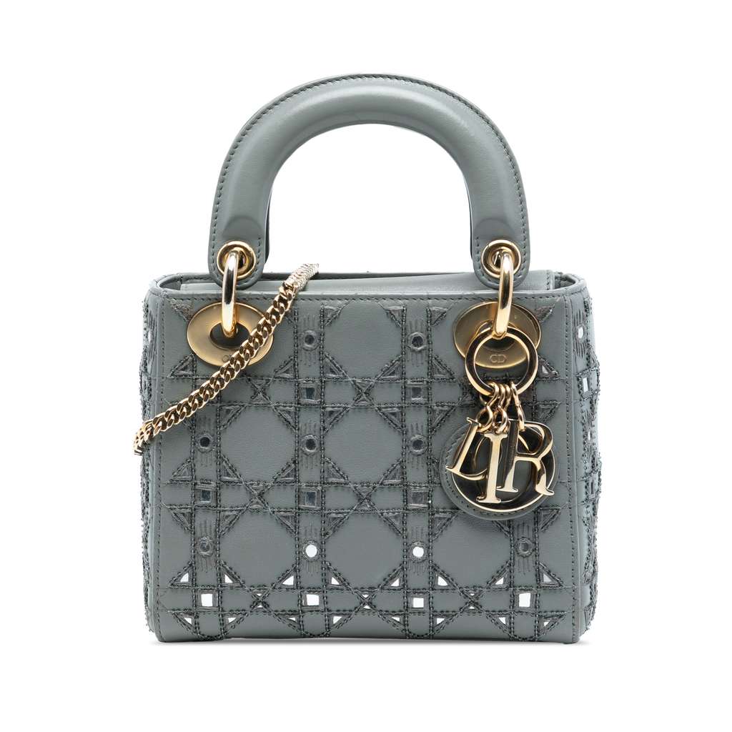 The Lady Dior features a leather body with beaded embellishments, flat leather handles, a detachable chain-link strap with leather shoulder guard, a fold-in flap closure, and an interior zip pocket.