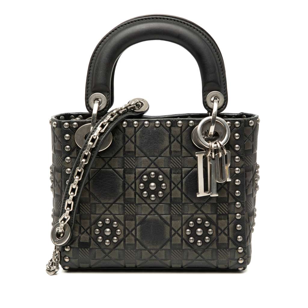 This Lady Dior satchel features an embossed and studded leather body, flat leather handles, a detachable chain link strap with leather guard, a fold-in flap closure, and interior zip and slip pockets.