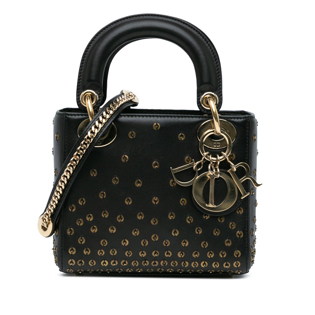 The Lady Dior features an embellished leather body, flat leather handles, a detachable curb chain shoulder strap with leather guard, a fold-in flap closure, and an interior pocket.