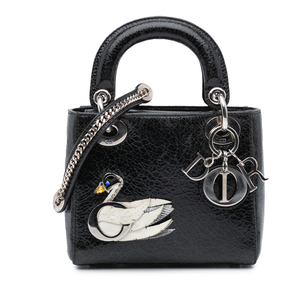 The Lady Dior features a ceramic effect deerskin body, flat handles, a detachable flat strap, a fold-in flap closure, and an interior zip pocket.