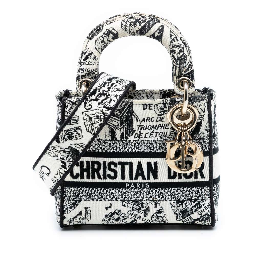 The Lady D-Lite features an embroidered canvas body, structured handles, a detachable flat strap, an open top with flap closure, and an interior zip pocket.