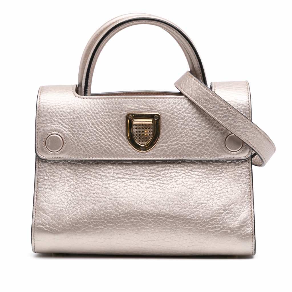 The Diorever features a leather body, rolled leather handles, an adjustable and detachable flat leather strap, a top flap with a push lock closure, and interior slip pockets.